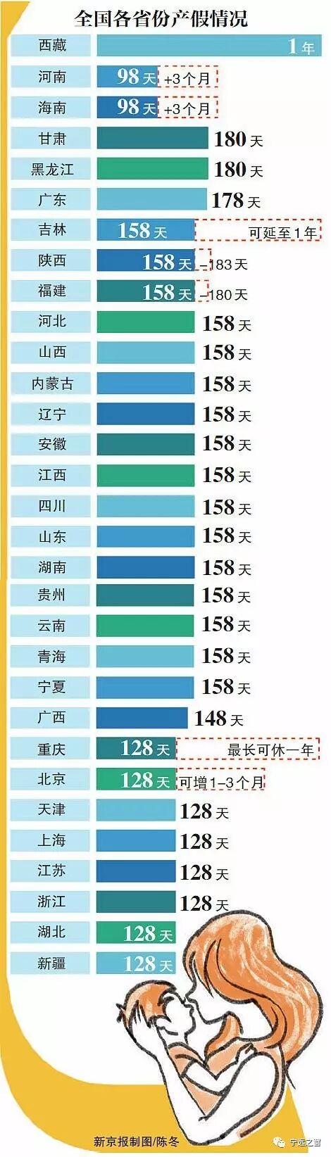 2016年1月1日,“全面二孩”政策正式落地。目前,全国30个省(区、市)已经延长了产假。近期,西藏调整现行干部职工生育待遇,女方每胎享受一年产假(含法定产假)。记者梳理发现,自“全面二孩”政策施行以来,西藏的产假是我国各省(区、市)中最长的。