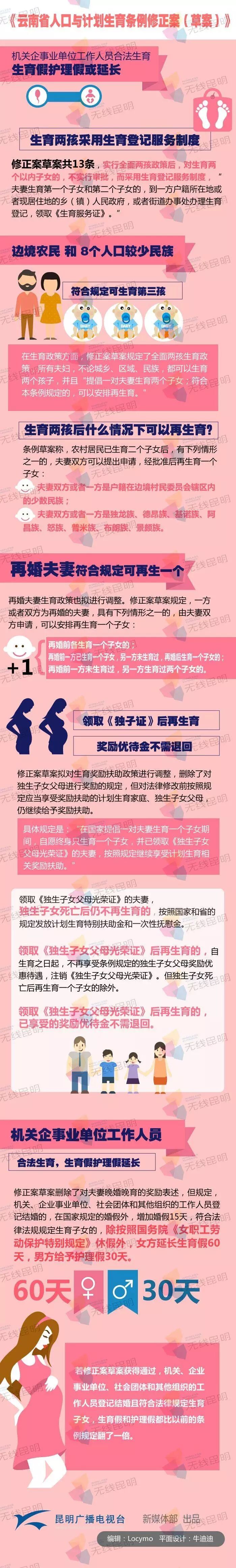 《云南省人口与计划生育条例修正案(草案)》,经省政府第80次常务会议讨论通过后,由省长陈豪签字提请本次会议审议。云南省卫生和计划生育委员会主任李玛琳所作说明称,由于国家生育政策调整,云南的生育政策也必须随之调整,做好新旧生育政策的衔接,并对云南原来的计生条例中独生子女的奖励扶助政策进行修改和调整。