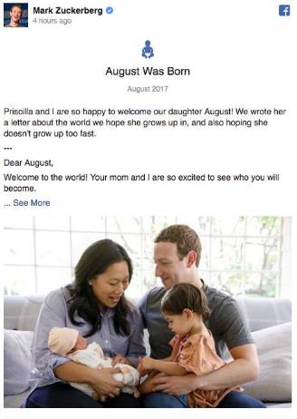 扎克伯格,这位世界上最有价值和最有影响力公司之一的负责人,在他诸多刷屏的新闻中——和华裔普莉希拉的爱情、几十件一模一样的灰色T恤、给女儿Max的一封信、捐出脸书99%的股份建立慈善基金等等,最让我感兴趣的是他又将休两个月产假陪伴二女儿August(中文网友亲切地称之为小八月)。
