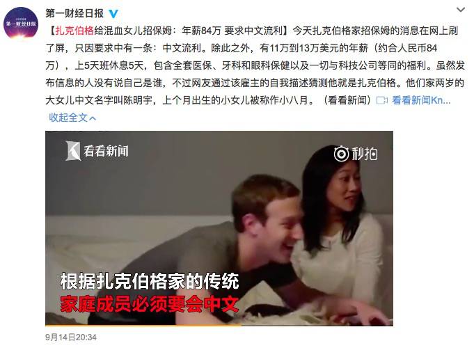 Facebook首席执行官马克·扎克伯格最近又双叒叕上热搜了,这次是因为他想给两个混血女儿招一位“中文流利”的保姆。