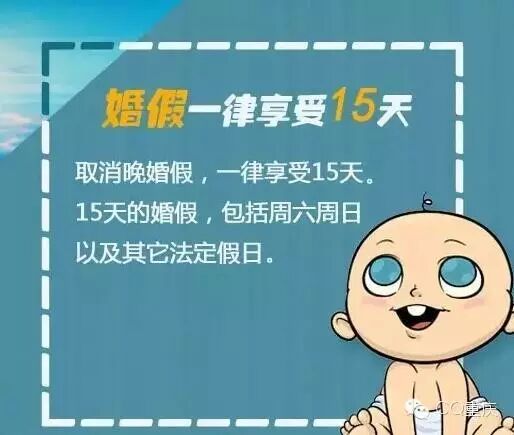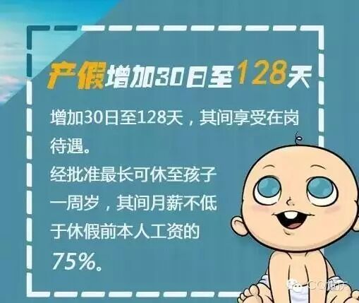 新条例提出:全面实行“二孩“政策,满足条件者可生”三孩”,夫妻享受婚假十五天,取消了晚婚假。产假增加30日,达到128天,产假期间享受在岗职工同等待遇。