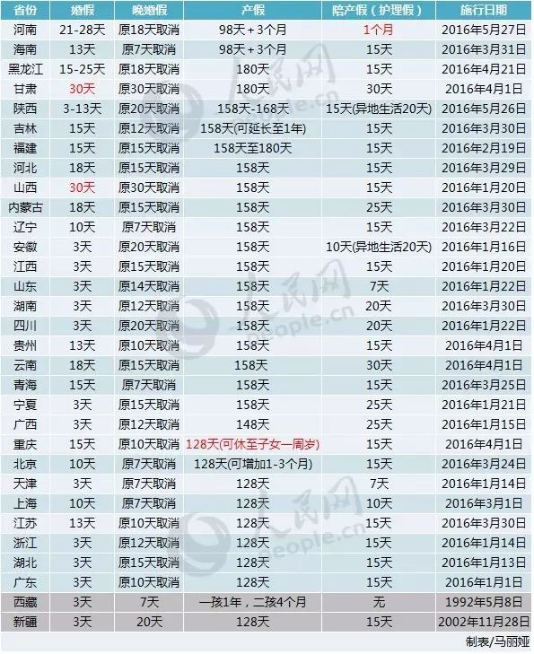 今年1月全国新修计生条例后各地产假排行。人民网7月制表
