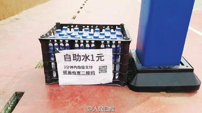 【无人售水点现篮球场 付钱凭自觉】据山西日报报道,在山西大学有这样一个场景,打球渴了,去旁边售水点扫二维码付款就能拿水,无售货员无监控,付钱凭自觉。设立诚信卖水点的是90后小伙张楷煜,他说每日所售瓶数和实际收款额基本一致,效果很好。