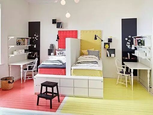 当然,如果你觉得以上的方式都太过局促,也可以用对半的形式和色彩来加以区分空间,让各自的空间都更具独立和隐私性。