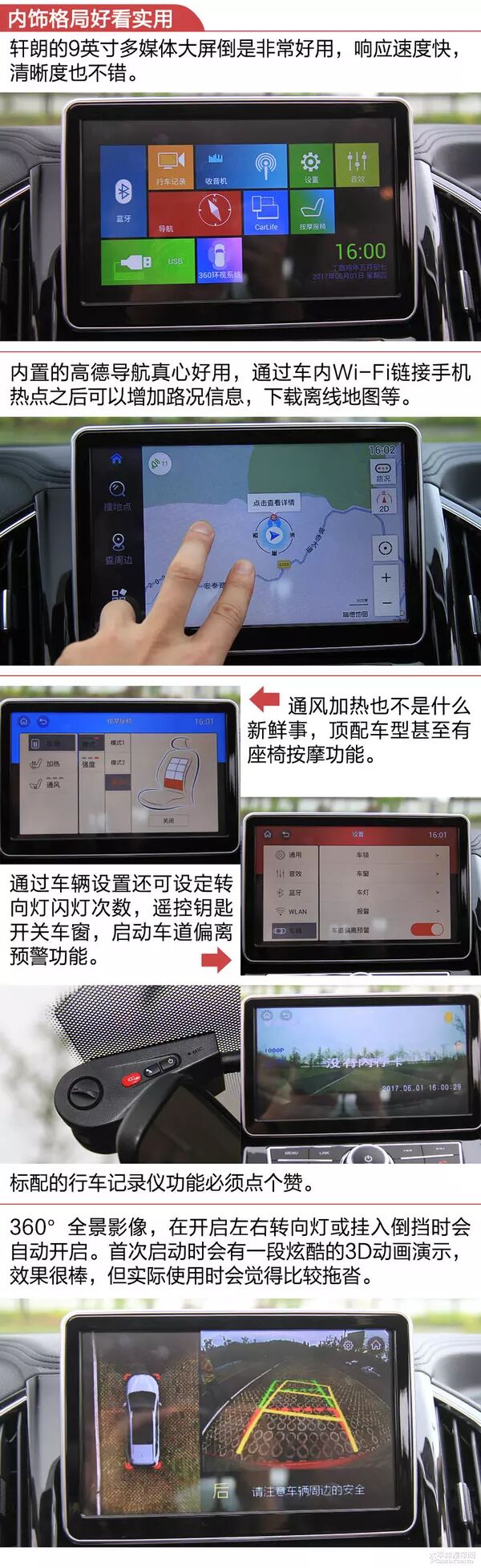 内饰方面,轩朗整体布局较为规整,车内大量采用软性材料和缝线设计,力求提升整体档次感。其次在中控台上,配有悬浮式9英寸中控液晶屏,其UI及触摸反馈手感都表现稳定。在配置方面,轩朗做得相当到位,驾驶座加热通风已经不是新鲜事,力帆甚至把按摩座椅给轩朗加上了,虽然仅有后背按摩,但效果可还真不赖。此外在车内后视镜的下方还有自带的行车记录仪,这一点必须得给个赞,对于用户的用车安全有实际的提升。