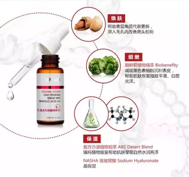 达尔肤杏仁酸里特别添加了朝鲜蓟植物精萃,这种成分很多保养品里都用它帮助排毒,用在护肤品里能减缓黑色素细胞在皮肤表层沉积,让脸蛋儿白皙透亮。