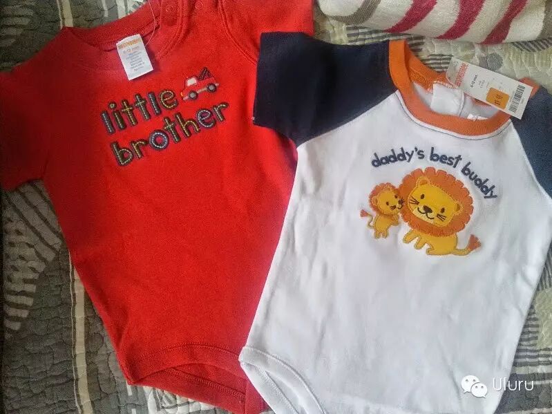 怀着二宝时,我就开始有意无意地培养大宝对弟弟的感情。时常让他摸摸我的肚子,隔着肚皮和小弟弟说话。给他读手足之情的绘本,还鼓励他编自己和弟弟的故事。我带他去买衣服,告诉他小弟弟穿他以前的衣服就行。他想都没想就对我说,“妈妈,也给小弟弟买两件新的吧。”,后来他就帮着挑了这件写着“Little Brother”(小弟弟)的包屁服。