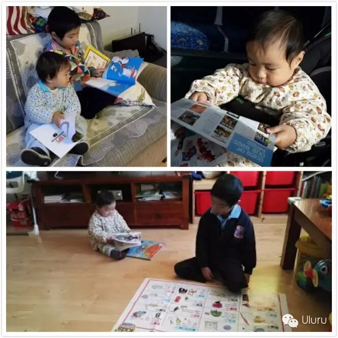 不知道是不是受哥哥的影响,二宝说话,读书,玩积木等等都比较早。就拿读书来说,从4,5个月能独坐开始就爱抱着本书翻来翻去。平时只要哥哥在读书,弟弟一定也会凑过去像模像样拿起一本书看起来。