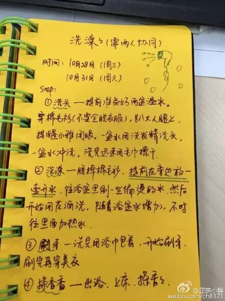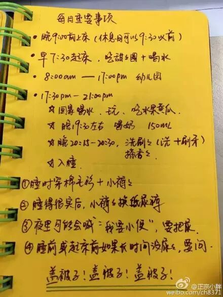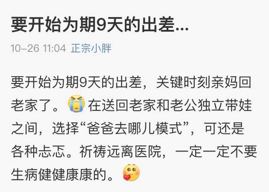 微博上一位名为“正宗小胖”的麻麻在出差前,给老公留下了满满当当6页“带娃指南”,很多爸爸妈妈都被戳中了心窝。从每天几点起床、吃什么、穿什么,一直到洗澡、洗衣服、周末看天气如何选择外出地点,可谓是事无巨细,全都交代的清清楚楚。