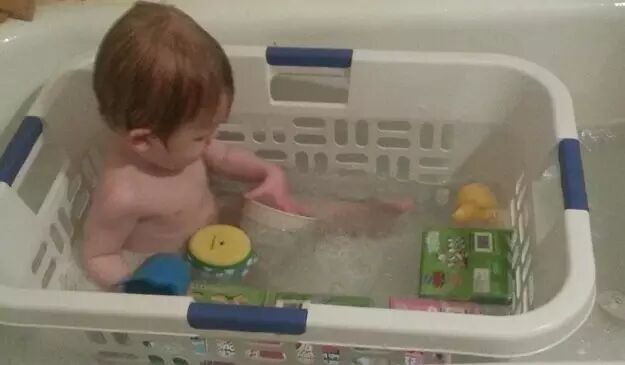 防止玩具漂的到处都是,一个洗衣篮就能帮大忙。