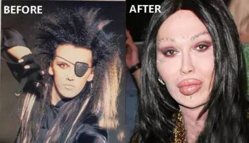 来自英国利物浦的女星Pete Burns,从小就喜好与众不同的打扮,成名之后,Pete Burns迷恋上了整容,因为整容失败,Pete Burns的容貌越整越丑,最后患上抑郁症。自从整容失败后,Pete Burns开始变得越来越没有自信,她不敢出门见人。因为整容失败,她几乎花光了自己所有的积蓄做面部修复手术,她的名气也越来越弱,不少粉丝都叫她“整容鬼”。在Pete Burns五十七的时候,因为心脏骤停而离开了人世,许多人评价Pete Burns的一生是可悲的,她大半辈子都在为整容而活,令人唏嘘。