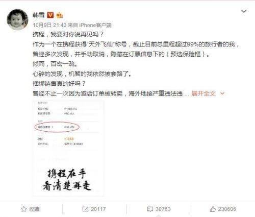 近日,携程再次因为搭售问题被曝光,演员韩雪发微博控诉携程,称因隐藏的捆绑消费被套路了,奉劝大家“看清楚再走!”昨晚,携程回应称,携程机票已注意到有些用户使用机票产品时反映的相关问题。对此,携程机票产品紧急整改,推出了“普通预订”窗口,客户可随时勾选取消。