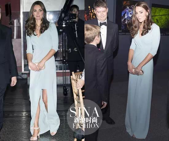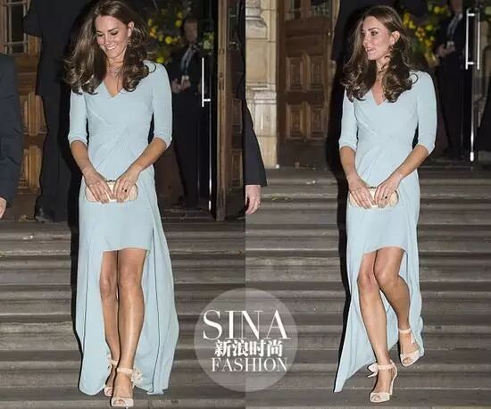 这条长到拖地的水蓝色裹身裙出自英国品牌Jenny Packham,裙子的设计非常特别,类似披风一般的从腰间开衩至脚踝,“披风”里面还包裹着长度至膝盖上方的短裙,既优雅又小露性感,只是不知道女王大 人看到膝盖以上的裙子会不会不高兴?搭配这一身水嫩长裙的绑带鱼嘴鞋来自L.K.Bennett品牌,浅浅的粉红和嫩嫩的水蓝让凯特无比小女人。
