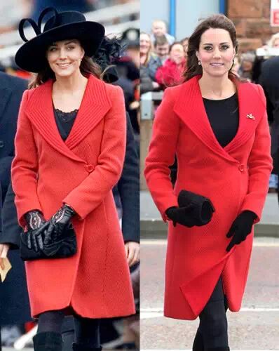 2013年4月5日在英国北部出席活动(右图),身穿红色Armani长外套,这件外套她曾在2006年出席威廉王子的阅兵仪式时(左图)穿过。