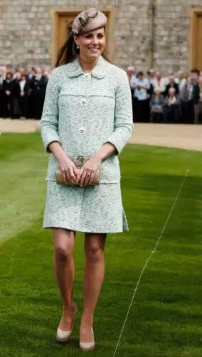 2013年4月21日在温莎城堡,身穿薄荷绿Mulberry大衣,搭配裸色L.K. Bennett高跟鞋,头饰来自英国制帽商Whiteley。