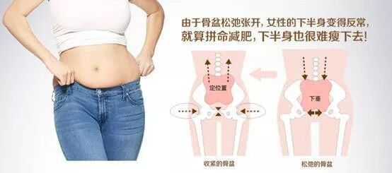 由于骨盆支撑着上半身,所以骨盆一松弛,要通过臂大肌和臂中肌这类臀部上的肌肉以及腰部的肌肉来支撑,导致体形走样,并容易发生腰痛以及肩酸等现象。甚至不能给脚上施出均等的力,严重的情况下,会造成步行障碍。另外,容易发生内脏,子宫下垂,严重的情况还会发生子宫脱垂。而且由于生产的原因,不光是骨盆,肌肉也会变得松弛,容易发生小便失禁。