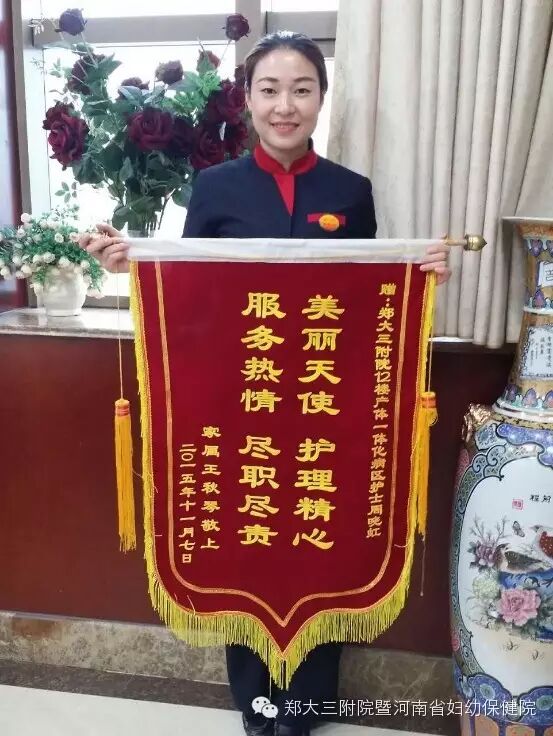 回到家后,王女士和宝宝一切健康,想到分娩期间周晓虹和护士们对自己热情周到的全程微笑服务,王女士专门制作了锦旗,和丈夫一起送到了郑大三附院,于是就出现了文章开头的一幕。