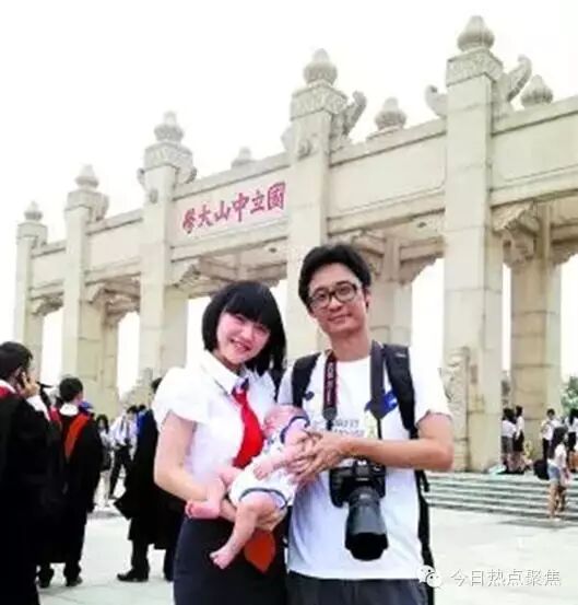(中山大学女学生曾佩伦与丈夫、儿子在中大北门拍毕业照)