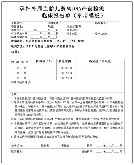 下图是一张NIPS报告单模板,报告内容很简单,只有三个检测项目:21-三体、18-三体和13-三体,报告的检测值为Z值,参考范围为:-3<Z<3,检测值在参考范围内的无论Z值大小均为低风险,而检测值>3或<-3的则为高风险。由于NIPS不是诊断性试验,因此即使筛查结果为低风险,只能说明胎儿罹患本检测目标疾病的风险很低,但不排除其他异常可能性,应当进行胎儿系统超声等其他检查;如检测结果为高风险,建议受检者接受遗传咨询及相应产前诊断。