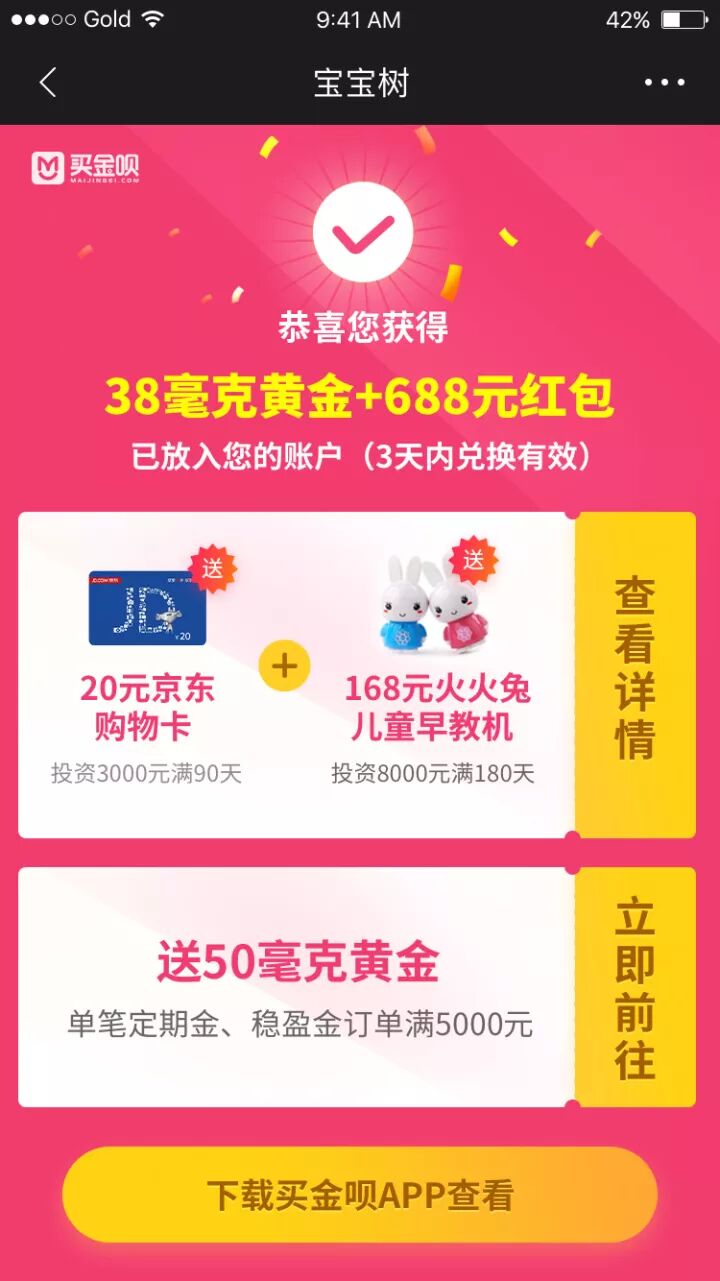 而且活动期间,投资黄金不仅能赚收益,满足对应条件再送京东购物卡、儿童早教机等大礼!