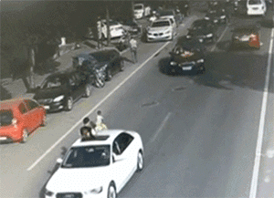 行驶的面包车,让我们怎么也不会料到会从后备箱滑下一个活生生的孩子。危险就在一线之间,好在孩子命大,没有生命危险。无独有偶,看看下面一幕: