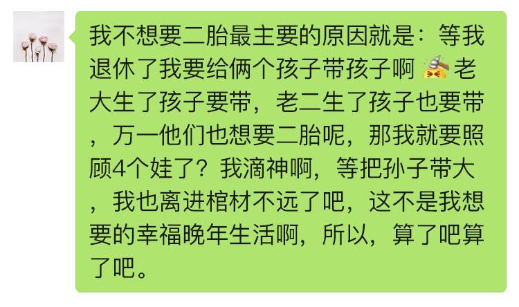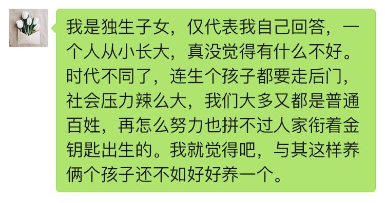 所有要俩孩子的无非就是一个理由:一个孩子太孤单了,等到我们老去的时候,留给他们的还有手足。但不生二胎的也是基于现实做出的决定,归根还是很个人的一件事。