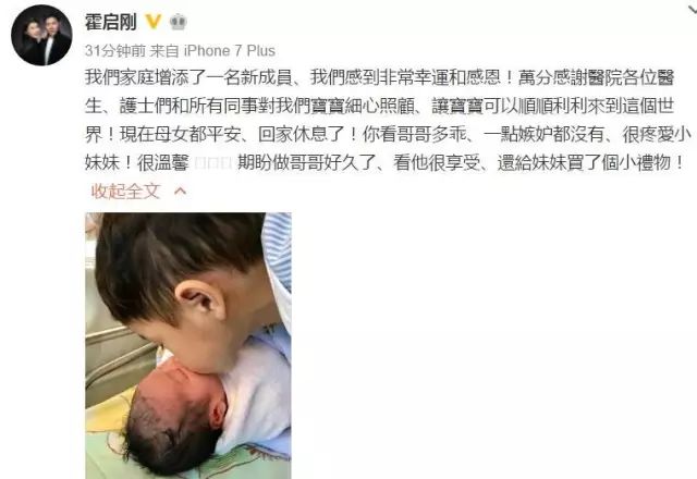 北京时间4月24日,霍启刚在微博高调宣布,妻子郭晶晶二胎生下一女,并晒出儿子亲吻小女儿的温馨照片~