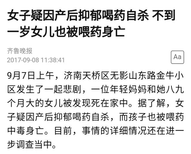 9月7日,济南某地发生了一起人间惨剧,一位身患产后抑郁的年轻妈妈,喝药自杀,而八九个月大的女儿也被妈妈喂了药,母女双双抢救无效,中毒身亡。