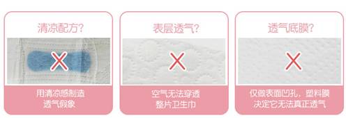 现在市面上的卫生巾都是采用传统的塑料底膜,空气根本无法真正穿透。欢迎大家拿出自家卫生巾与下图对号入座。