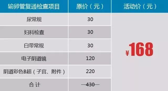 尊享168元(原价430元)的结扎后复通优惠检查套餐