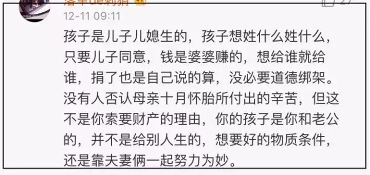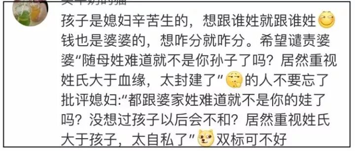 而大部分网友认为双方都没错,每个人都有选择的权利,儿媳可以选择让孩子跟自己姓,婆婆也可以选择把家产给谁继承。