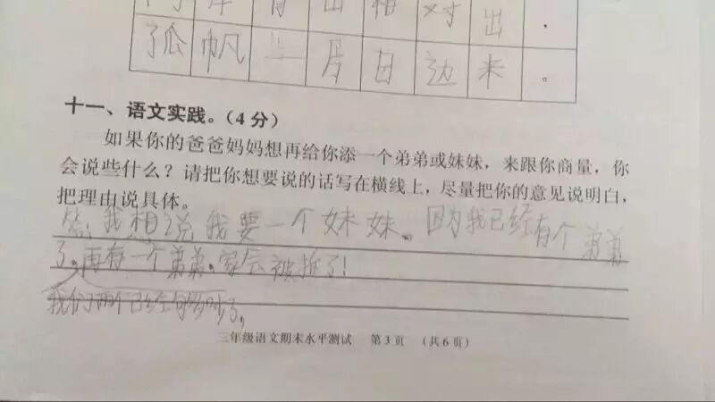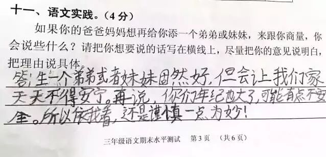 “爸妈生二胎,老大啥感受?”广州天河区三年级语文考试题与时俱进地考起了二胎政策。三年级小学生的答案让人笑趴了,求爸爸妈妈看到卷子之后的心理阴影面积!
