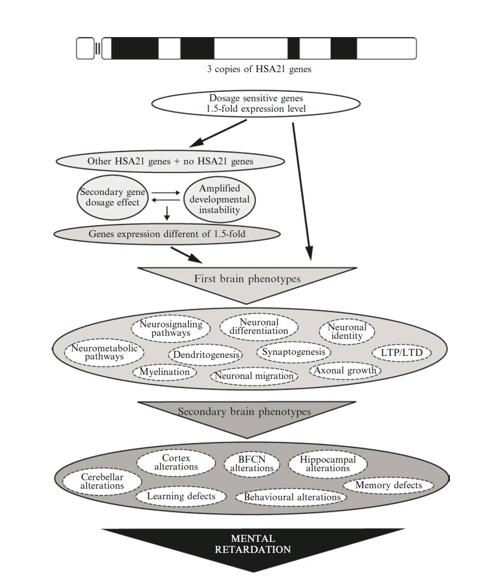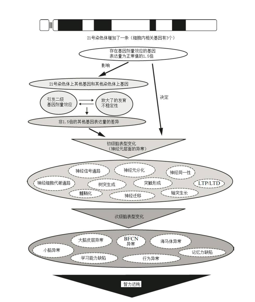 2011年,Mohammed Rachidi和Carmela Lopes在《Mental Retardation and Human Chromosome 21 Gene Overdosage: From Functional Genomics and Molecular Mechanisms Towards Prevention and Treatment of the Neuropathogenesis of Down Syndrome》(点击文末原文链接能下载原文PDF文件,中文参考文献可上中国知网下载《唐氏综合征智力低下的细胞分子机制_丁奕靖》)一文中,对唐氏综合征的细胞分子机制的最新研究作了很详细的综述。文中假说的总体框架如下图: