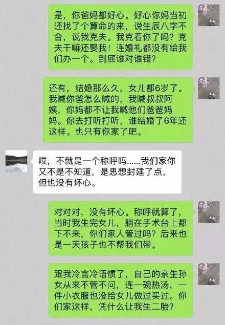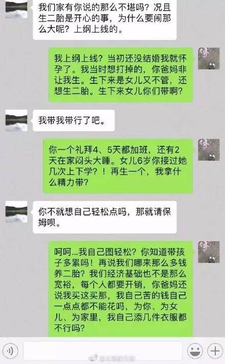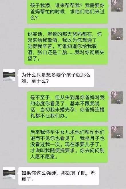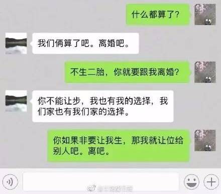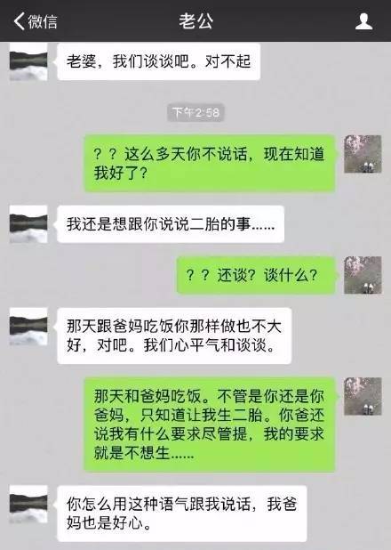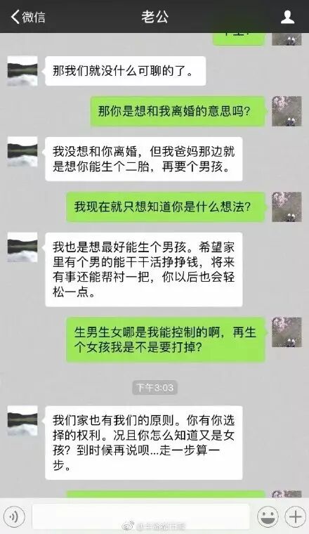 一对夫妻讨论要不要二胎的聊天记录被截图贴出来,因为一胎是女孩,所以丈夫要求妻子,不生二胎,不生男孩,那就离婚。让人看得牙痒痒,恨不得把那个男人从聊天记录里揪出来狠狠揍一顿解气。