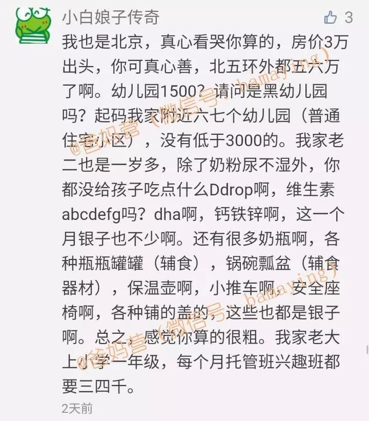 来,让我们来看看上次前100个留言中的10多个城市爸妈晒养娃账单