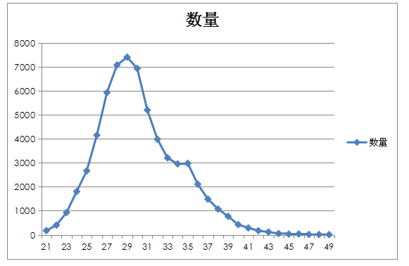 28岁和30岁占的比例也很高,分别为11.27%和11.04%,这三个年龄组组就占了全部二孩出生的1/3(34.1%),然后随年龄的降低或升高二孩出生人数逐渐降低,27岁到31岁的妇女生育的二孩能占到1/2(51.82%),25到35岁能占到4/5以上(83.56%)。