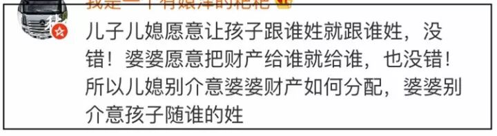 大部分网友认为双方都没错,每个人都有选择的权利,儿媳可以选择让孩子跟自己姓,婆婆也可以选择把家产给谁继承。