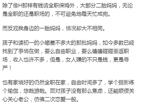 二胎妈妈H家境优渥,老公自己当老板,H介于全职妈妈和全职太太之间:家务全部有保姆做,她只管照顾孩子。