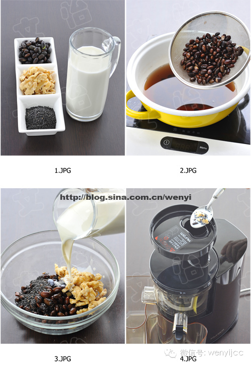 2)将煮好的黑豆,核桃,黑芝麻,牛奶(冷,热,常温均可)混合。