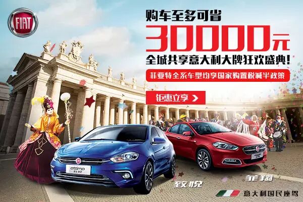 即日起,购菲亚特菲翔、致悦等车型最高为您省3万块!还享受0利率0首付哦亲!另外加送3000元购车大礼包!