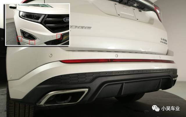 锐界的尾部设计饱满厚重,运动版车型增加了独有的“S”标,保险杠下面黑色尾唇,双边双出的方形排气镶嵌其中。
