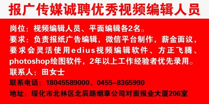 关注绥化报广传媒免费看绥化日报、绥化晚报同步电子版。绥化报广传媒是绥化最实用的公众信息平台,我们为网友提供房屋买卖租兑,招聘求职、家政、便民、装修、旅游、美食、活动以及商务等本地信息,点击阅读原文,可免费查找相关内容。绥化报广传媒微信公众平台邮箱2794900065@qq.com。(欢迎各位读者踊跃提供新闻爆料,一经采纳将有稿酬奖励)