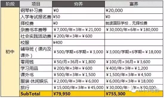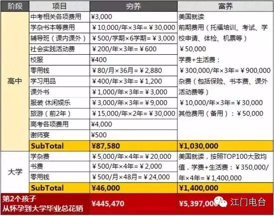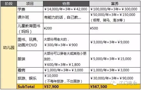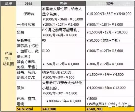 而坊间理财高手,更是发布了高阶版本的预算参考——根据“穷养、富养”的理论,列出了2套生养“二胎”的花销数据,以供参考。