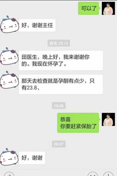 虽然几近心灰意冷,但是想要二宝的他们还是没有放弃,几经辗转苏女士夫妻二人来到了伊丽莎白,寄希望于田金环主任,希望能帮助他们查出二胎难怀到底是哪里出了问题。田金环主任首先对苏女士进行了详细的问诊,然后又对其身体进行了针对性的检查,查完之后发现其居然是输卵管堵塞,而且还是双侧都堵塞了!针对这一难题,田主任先为苏女士做了输卵管疏通微创手术,术后一个月,为巩固治疗效果和更彻底地解决输卵管堵塞后患,再次为其进行双侧输卵管通水,整个治疗过程很成功,苏女士回家静心修养调理了两个月后,在田主任的科学指导下,夫妻两个再次积极“造人”,终于在八月的最后一天里传来苏女士成功受孕的喜讯!这一次成功怀孕苏女士不敢再掉以轻心,于是马上到医院进行相关怀孕指数测定,在得知黄体酮偏低时,马上联系田主任,并听从田主任安排和指导进行保胎治疗。