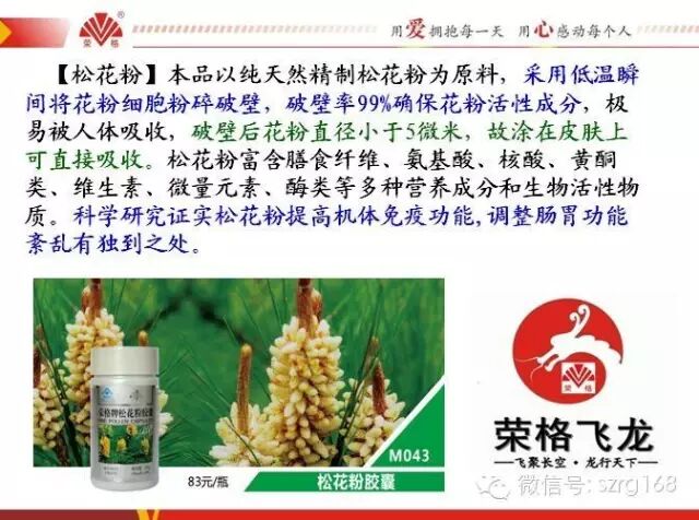 本品以纯天然精制松花粉为原料,采用低温瞬间将花粉细胞粉碎破壁,破壁率99%确保花粉活性成分,极易被人体吸收,破壁后花粉直径小于5微米,故涂在皮肤上可直接吸收。松花粉富含膳食纤维、氨基酸、核酸、黄酮类、维生素、微量元素、酶类等多种营养成分和生物活性物质。科学研究证实松花粉提高机体免疫功能,调整肠胃功能紊乱有独到之处。