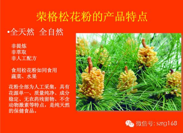 松花粉是松树的精细胞,担负着松树繁衍的重任,它是松树的精华,内含最长寿生命体所需的多种营养成分,其中包括多种蛋白质、氨基酸、矿物质、酶与辅酶、核酸、黄酮、单糖、多糖等,总量达200余种,且搭配合理,能够全面补充、均衡人体所需的营养。