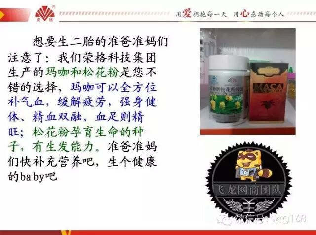 想要生二胎的准爸准妈们注意了:我们荣格科技集团生产的玛咖和松花粉是您不错的选择,玛咖可以全方位补气血,缓急疲劳,强身健体,精血双融、血足则精旺;松花粉孕育生命的种子,有生发能力。准爸准妈们快补充营养吧,生个健康的baby吧