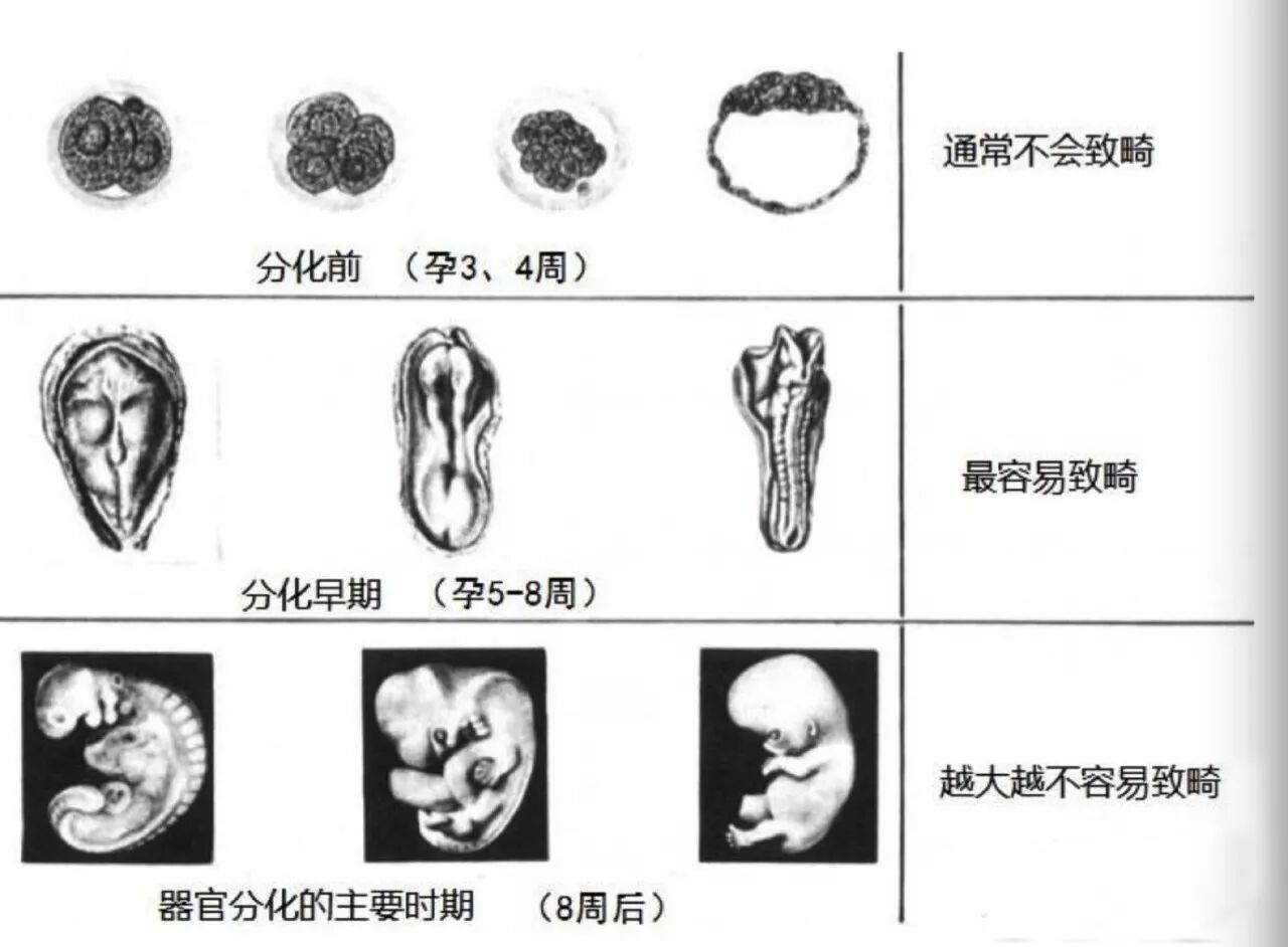 如上图所示,在分化早期,如果有影响,那么是致畸最严重的时间点。所以,一般认为,怀孕前三个月是致畸的敏感时期;3 个月以后,各系统分化基本结束,就是个发展长大的过程了,这个时期的致畸作用又有所下降。