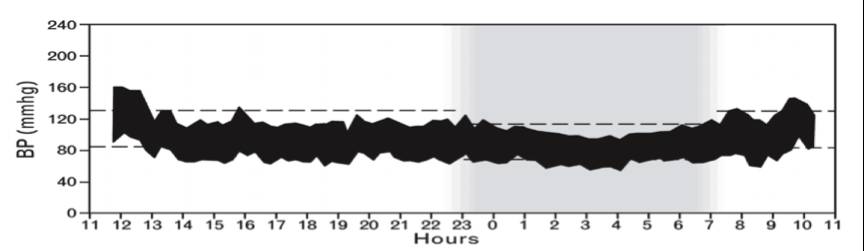 1、白大衣高血压:白大衣高血压是指诊所测量血压高,而家庭自测血压正常;动态血压显示在医院刚背上动态血压的时间段血压升高,第二天来还动态血压的时间段血压也升高,但在家的这段时间血压均正常。这种情况在女性很多见,一般与到医院时情绪紧张有关,这样的高血压,不是真正意义的高血压,一般脱离医院的环境,血压就正常(如下图所示)。这种情况的女性怀孕后一般血压平稳,预后良好。但也有研究表明白大衣高血压的女性在20周发展为妊娠高血压或先兆子痫的比例比正常血压者高,所以一旦怀孕必须在家严格监测血压。