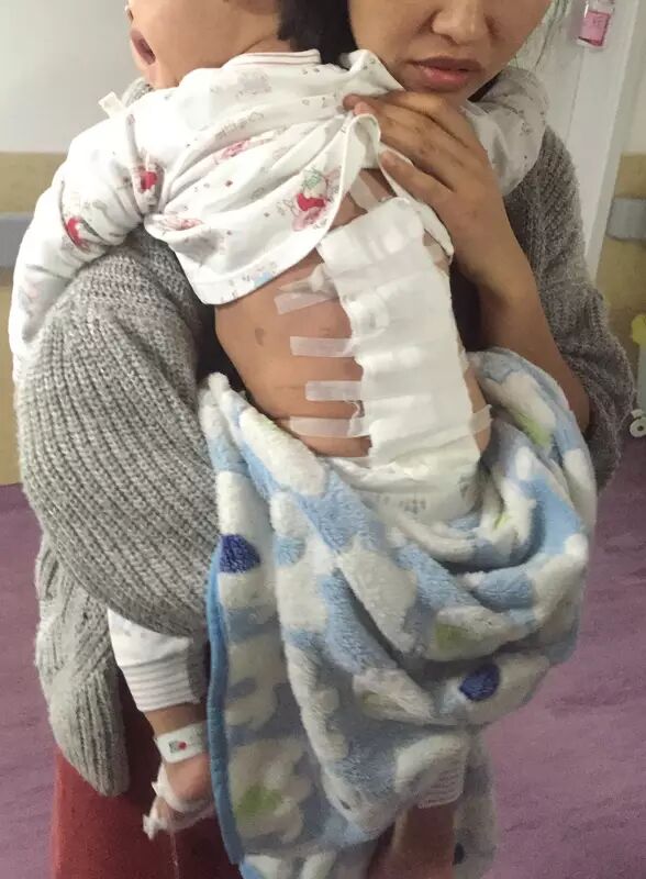 文文眼睛大大,脸蛋鼓鼓,长得非常漂亮。孩子看见陌生的记者阿姨,害羞的把小脑袋埋进妈妈胸前。妈妈左手抚摸文文的脑袋,右手掀起孩子的衣服给我看,背上敷着的厚厚纱布提示了孩子刚刚做完一场大手术。